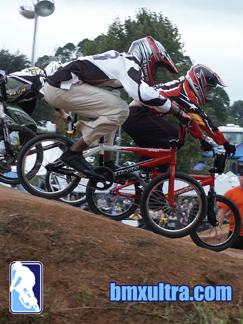As far as the bmxultra.com riders go Jason Bergstrom didn't make it out to the motos, he had a very tough gate on both bikes. But should still be in good standing overall though, sitting around #20 in 30-34 Expert Men's class. I had a 2-2-4 in the motos, I crashed in the last one on the last jump in the last straight just a few yards short of the finish line. It was a race where the lead changed a few times, but entering the last corner me and a couple of others were heading in 3 wide, so I high lowed, and pulled up next to the guy in front. I think I was focusing more on trying to take the win and forgot all about the last couple of jumps. After leaving a big whole in the ground where my knees and head buried themselves, I got up slowly and felt weak and numb in the knees so I dragged my bike across the finish line and checked myself out. There was nothing too serious, just lots of bruising and lumps...oh and it only hurts when I twist it. What was cool was one of the guys from Puerto Rico, I think his name is Gregorio Rivera Serrano, came over to check that I was ok and helped me to my feet. He was one of the guys in the battle for the first. It's funny to think, two guys both foreign to the US, fighting it out on the track for a US national ranking, sharing the same passion for BMX. He had nothing to do with my fall but yet he still managed to take time to check that I was ok. In a very manly sporty style hand shake/embrace he said "good race", the thing was it was a great race, and I told him so. It's the kind of race I have been looking for in a long time, close, and only when a rider crossed the line would you know who would take the win, it's something that reminded me of what BMX is all about. Actually the 35 & Over expert class is a big class and full of very skilled and powerful riders. It has been a lot tougher than I ever expected, and at the end of the day those guys also have a great deal of respect for each other both on and off the track.