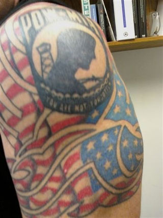 TP: I got the bottom half in 2000. After much thought and wanting to get a tattoo for years. I really wanted something that was timeless and I would always like and appreciate. So the American flag came to mind and it just went on from there. Keep in mind that this does not represent in any way the politicians. It represents what America is suppose to be about.. freedom to live YOUR dream, whatever that might be. I added the POW (prisoner of war) and MIA (missing in action) just this year. I work with and know a lot of people who either served in the Military or their sons or daughters did or currently serve. I can't say enough about how grateful I am to the ones who served in the past or currently serve. What a sacrifice they make for the betterment of mankind. I will say that every time they play the national anthem before a race, I say thank you to the people that made and continue to make it possible for me (a grown man) to race around the BMX track. I believe a tattoo should have some meaning to the person who wears it, mine means a lot to me. I am very proud of my home and country called the USA.