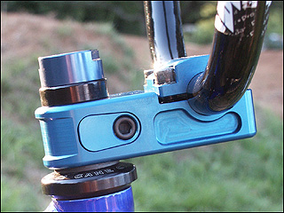 The Supercross Racerhead stem has had a bit of a face lift. It looks very different to the original model we reviewed nearly 12 months ago. Sure, it's still a 4 bolt top loader, and sure it's still the same basic shape, with the same single bolt cam system to clamp down hard on the fork steerer tube.